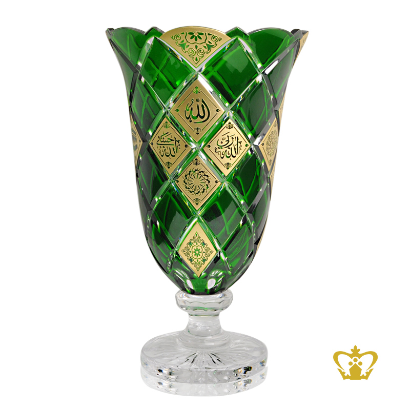 Green Crystal Vase Footed with Deep Cross cuts Crown Edged Handcrafted Islamic Decorative Present Golden Arabic word Ramadan Religious Occasions Souvenir Eid Gift
