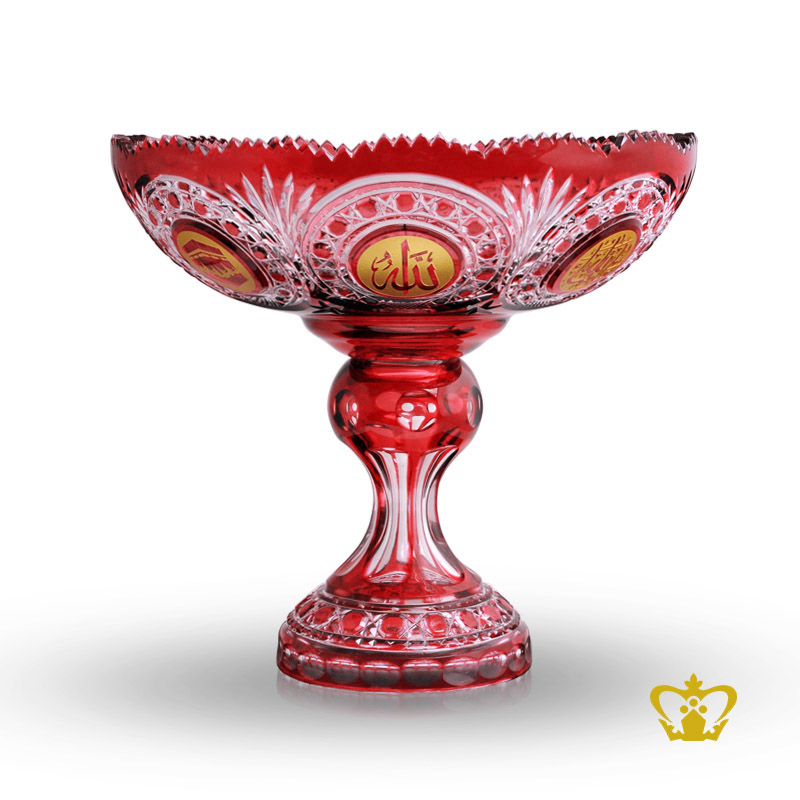 Ruby Red Footed crystal Decorative Bowl Handcrafted with Deep Leaf diamond cuts Golden Arabic word Calligraphy Allah Islamic Religious Occasions Present Ramadan Souvenir Eid Gifts