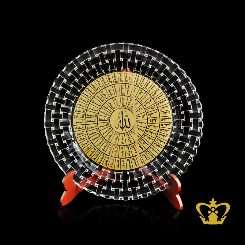 Modish elegant pattern crystal centerplate with Arabic Islamic golden word calligraphy Asma Al Husna lovely religious occasions Eid Ramadan souvenir gift