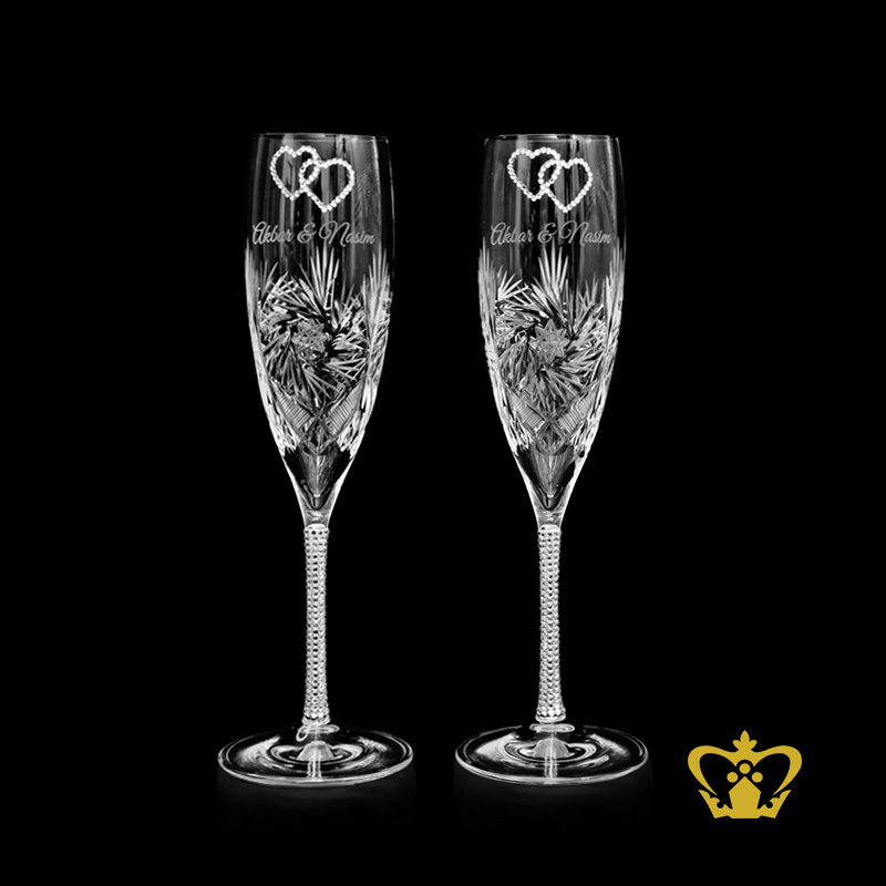 Pair of champagne flute couple name engraved crystal cuts twirling star deep leaf swarovski stones on stem and heart design wedding engagement anniversary gift