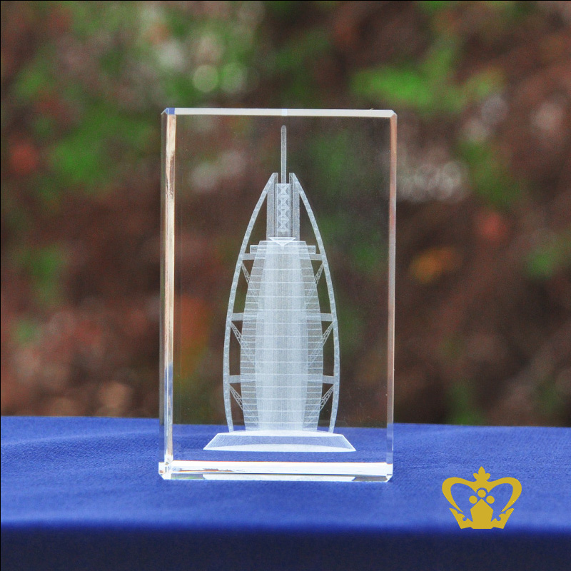 The Burj Al Arab is the 4th tallest hotel in the world, standing a staggering 321m or 1,053ft tall. The Burj Al Arab (Arabic: Tower of the Arabs) is a luxury hotel located in Dubai, United Arab Emirates. You can personalize this crystal cube or rectangular crystal block by engrave your own photo, logo, text, design or any ideas. Click on customize button and upload your image or text and buy online, you can also click on enquiry button we will respond as soon as we can. To produce a 3D crystal, firstly our designers transform any of your ordinary photographs into amazingly 3D images. Then it imprinted or engraved in glass cube using our precision laser technology in crystal cube. 3D crystal cube or blocks are often used for 3D or 2D crystal portraits and given as gifts for wedding, birthdays, Valentine's Day, mother's day, father's day, graduation, convocation , remembrance, memorial or anniversary gift. There are also great corporate or business gifts for recognition awards, promotional paperweights and event mementos. Corporate logos laser engraved inside of the crystal make elegant client and employee gifts. These laser crystals accommodate 3D layered designs where text and image can be engraved at different depths in the crystal. You can add an optional light base and the interaction of the white LED light with the engraving creates bright and sparkling 3D keepsake.