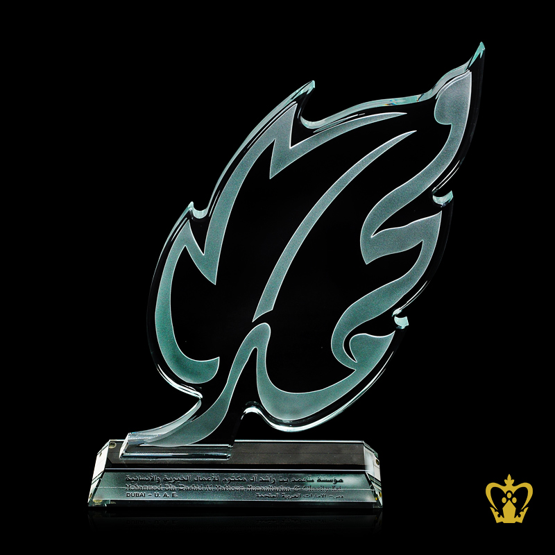 Handcrafted Crystal Trophy with Leaf Theme stands on Clear Base Customized Text Engraving Logo Base UAE Famous Gifts