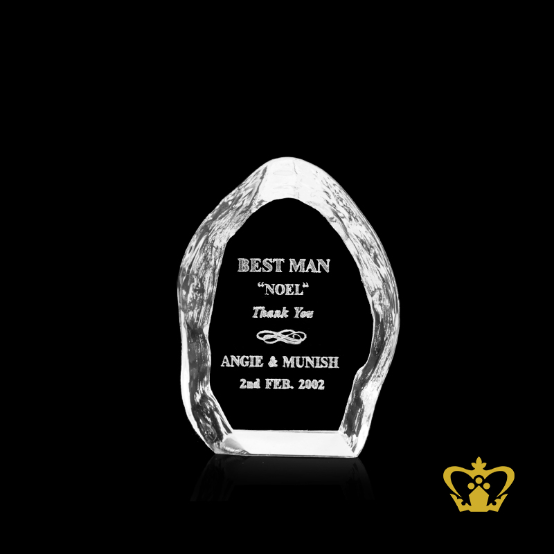 Creative Decoration Crystal Iceberg shape Craft for Engraving Logo or text suitable as an award, corporate gift, seasonal gift, it can easily customized with your company logo and or text it easily records the recipient's achievements and is ideal for commemorating exceptional staff performance anniversaries and other milestone events. This distinguished crystal iceberg is the perfect gift for recognizing honorable careers, years of service award, and outstanding accomplishments. Crystal Gallery having huge collection of custom made iceberg shape clear blank crystal trophy, engraved crystal glass iceberg for gift, religious artifacts iceberg shape gifts etc.