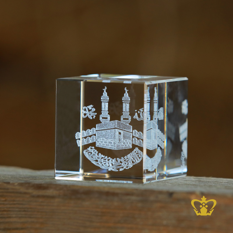 Eid Ramadan Gift Crystal Cube with Arabic Word Calligraphy Allah , Muhammed , Bismillah Ir Rahman Ir Rahim and The Holy Kaaba Laser Engraved Customized Islamic Religious Occasions Souvenir