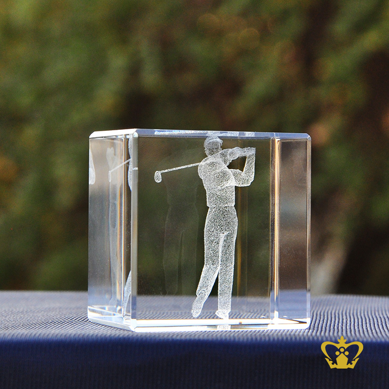 Gifting an ardent fan of the sport a golfer effigy in crystal seems like an apt memento for the like. You can personalize this crystal cube or rectangular crystal block by engrave your own photo, logo, text, design or any ideas. Click on customize button and upload your image or text and buy online, you can also click on enquiry button we will respond as soon as we can. To produce a 3D crystal, firstly our designers transform any of your ordinary photographs into amazingly 3D images. Then it imprinted or engraved in glass cube using our precision laser technology in crystal cube. 3D crystal cube or blocks are often used for 3D or 2D crystal portraits and given as gifts for wedding, birthdays, Valentine's Day, mother's day, father's day, graduation, convocation , remembrance, memorial or anniversary gift. There are also great corporate or business gifts for recognition awards, promotional paperweights and event mementos. Corporate logos laser engraved inside of the crystal make elegant client and employee gifts. These laser crystals accommodate 3D layered designs where text and image can be engraved at different depths in the crystal. You can add an optional light base and the interaction of the white LED light with the engraving creates bright and sparkling 3D keepsake.