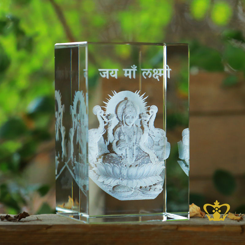 Lakshmi is revered as the Hindu goddess of prosperity, wealth & fortune. She is known to bring good luck to her devotees. You can personalize this crystal cube or rectangular crystal block by engrave your own photo, logo, text, design or any ideas. Click on customize button and upload your image or text and buy online, you can also click on enquiry button we will respond as soon as we can. To produce a 3D crystal, firstly our designers transform any of your ordinary photographs into amazingly 3D images. Then it imprinted or engraved in glass cube using our precision laser technology in crystal cube. 3D crystal cube or blocks are often used for 3D or 2D crystal portraits and given as gifts for wedding, birthdays, Valentine's Day, mother's day, father's day, graduation, convocation , remembrance, memorial or anniversary gift. There are also great corporate or business gifts for recognition awards, promotional paperweights and event mementos. Corporate logos laser engraved inside of the crystal make elegant client and employee gifts. These laser crystals accommodate 3D layered designs where text and image can be engraved at different depths in the crystal. You can add an optional light base and the interaction of the white LED light with the engraving creates bright and sparkling 3D keepsake.
