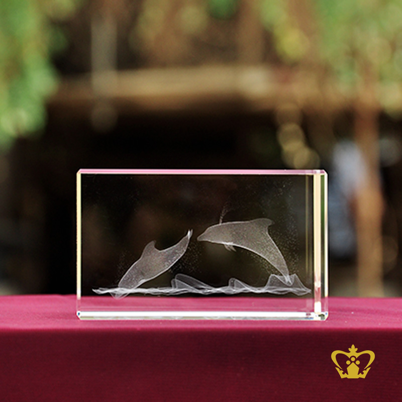 Crystal rectangular cube 3D laser engraved dolphin