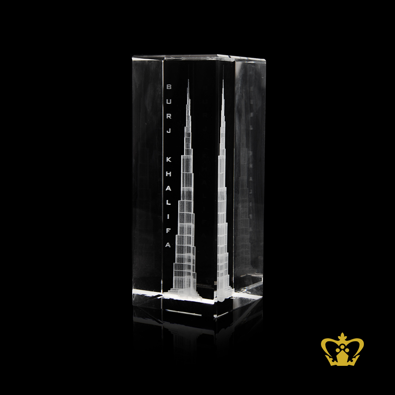 The tallest building in the world perfectly captured in crystal. The Burj Khalifa (Arabic for "Khalifa Tower"), known as the Burj Dubai prior to its inauguration in 2010, is a skyscraper in Dubai, United Arab Emirates. The Burj Khalifa has been the tallest structure and building in the world since its topping out in 2009. You can personalize this crystal cube or rectangular crystal block by engrave your own photo, logo, text, design or any ideas. Click on customize button and upload your image or text and buy online, you can also click on enquiry button we will respond as soon as we can. To produce a 3D crystal, firstly our designers transform any of your ordinary photographs into amazingly 3D images. Then it imprinted or engraved in glass cube using our precision laser technology in crystal cube. 3D crystal cube or blocks are often used for 3D or 2D crystal portraits and given as gifts for wedding, birthdays, Valentine's Day, mother's day, father's day, graduation, convocation , remembrance, memorial or anniversary gift. There are also great corporate or business gifts for recognition awards, promotional paperweights and event mementos. Corporate logos laser engraved inside of the crystal make elegant client and employee gifts. These laser crystals accommodate 3D layered designs where text and image can be engraved at different depths in the crystal. You can add an optional light base and the interaction of the white LED light with the engraving creates bright and sparkling 3D keepsake.