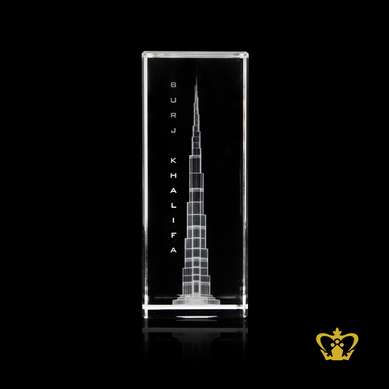 The tallest building in the world perfectly captured in crystal. The Burj Khalifa (Arabic for "Khalifa Tower"), known as the Burj Dubai prior to its inauguration in 2010, is a skyscraper in Dubai, United Arab Emirates. The Burj Khalifa has been the tallest structure and building in the world since its topping out in 2009. You can personalize this crystal cube or rectangular crystal block by engrave your own photo, logo, text, design or any ideas. Click on customize button and upload your image or text and buy online, you can also click on enquiry button we will respond as soon as we can. To produce a 3D crystal, firstly our designers transform any of your ordinary photographs into amazingly 3D images. Then it imprinted or engraved in glass cube using our precision laser technology in crystal cube. 3D crystal cube or blocks are often used for 3D or 2D crystal portraits and given as gifts for wedding, birthdays, Valentine's Day, mother's day, father's day, graduation, convocation , remembrance, memorial or anniversary gift. There are also great corporate or business gifts for recognition awards, promotional paperweights and event mementos. Corporate logos laser engraved inside of the crystal make elegant client and employee gifts. These laser crystals accommodate 3D layered designs where text and image can be engraved at different depths in the crystal. You can add an optional light base and the interaction of the white LED light with the engraving creates bright and sparkling 3D keepsake.