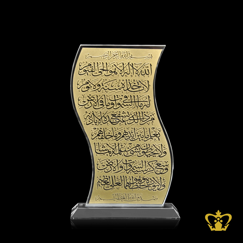 Crystal wave cutout golden Arabic word calligraphy Ayat Al Kursi engraved with clear base Ramadan eid gifts religious occasions Islamic souvenir