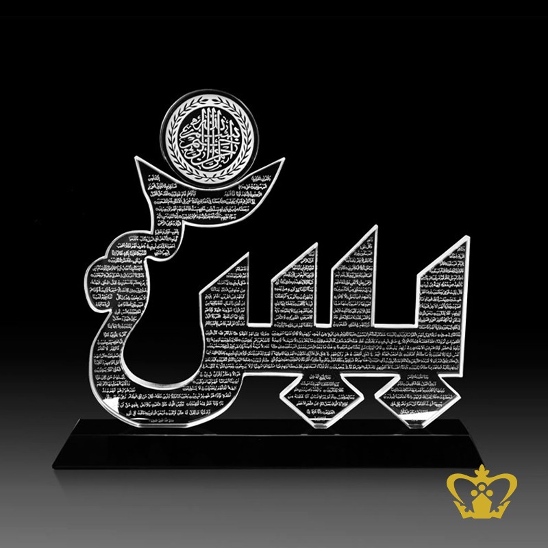 Hand-Crafted-Sura-Yasin-engraved-Crystal-Cut-out-Plaque-with-Black-Base-Islamic-gift-Ramadan-eid-Souvenir Product Product