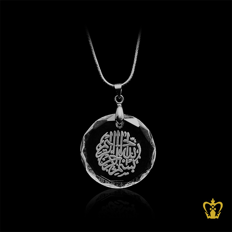 Round Crystal Pendant Diamond Cut Arabic Word Calligraphy Bismillah Ir Rahman Ir Rahim Engraved Religious Islamic Souvenir Eid Ramadan Ocassions Gift