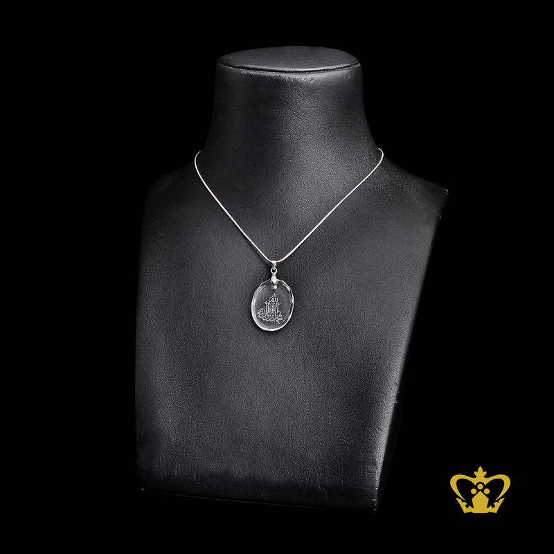 Crystal Diamond Cut Oval Pendant with Arabic word Calligraphy Engraved La ilaha illa Allah Muhammed rasul Allah Islamic Religious Occasions Gift Eid Ramadan Souvenir