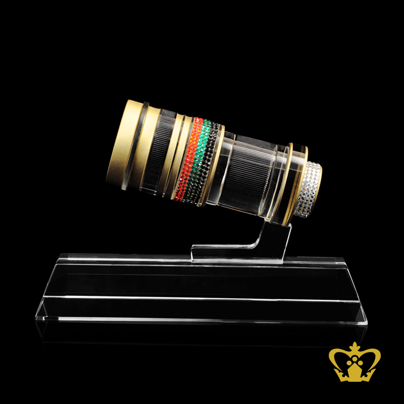Masterpiece crystal replica of a camera lens embellish with multicolor crystal diamond stands on clear base