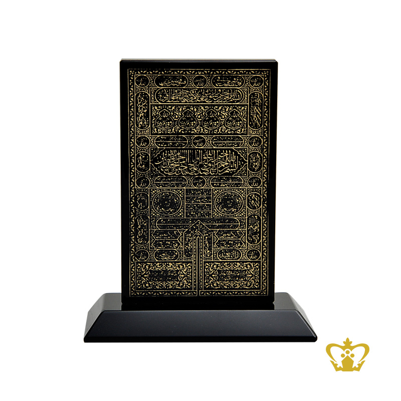 Arabic golden word calligraphy holy Kaaba door handcrafted kiswah cover engraved black crystal plaque with base Islamic occasion gift Eid Ramadan souvenir