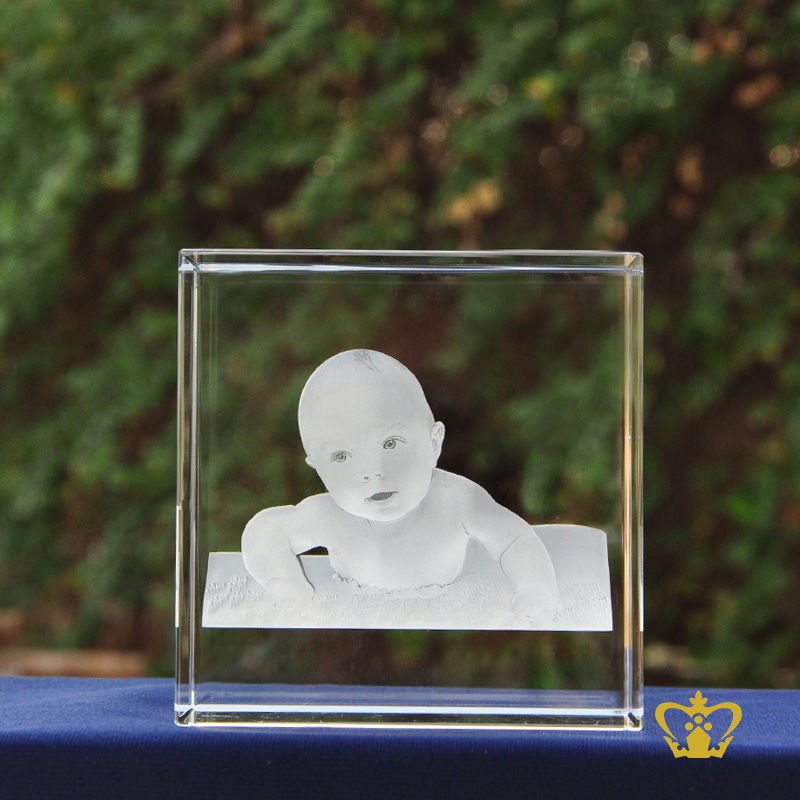 Say goodbye to dreary frames & instead have a 3D image of your adorable baby set in a clear crystal cube. You can personalize this crystal cube or rectangular crystal block by engrave your own photo, logo, text, design or any ideas. Click on customize button and upload your image or text and buy online, you can also click on enquiry button we will respond as soon as we can. To produce a 3D crystal, firstly our designers transform any of your ordinary photographs into amazingly 3D images. Then it imprinted or engraved in glass cube using our precision laser technology in crystal cube. 3D crystal cube or blocks are often used for 3D or 2D crystal portraits and given as gifts for wedding, birthdays, Valentine's Day, mother's day, father's day, graduation, convocation , remembrance, memorial or anniversary gift. There are also great corporate or business gifts for recognition awards, promotional paperweights and event mementos. Corporate logos laser engraved inside of the crystal make elegant client and employee gifts. These laser crystals accommodate 3D layered designs where text and image can be engraved at different depths in the crystal. You can add an optional light base and the interaction of the white LED light with the engraving creates bright and sparkling 3D keepsake.