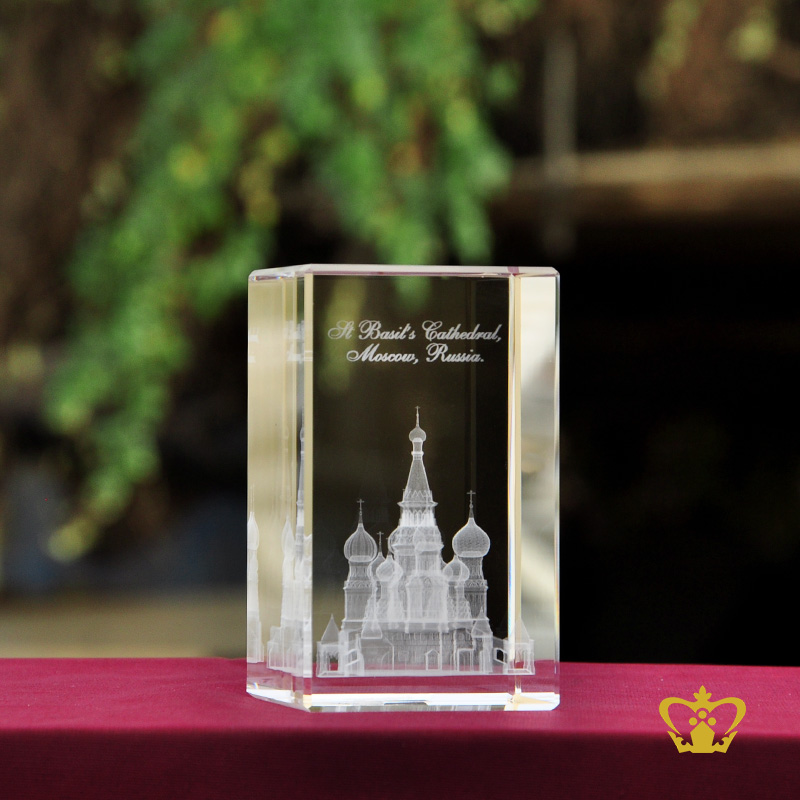 St. Basil's Cathedral, also known as the Cathedral of Intercession, is a very famous cathedral in Moscow, Russia was commissioned by Ivan IV (Ivan the Terrible), for Saint Basil the Blessed. It is in the area called Red Square. It was built in 1555-1561. ... The Cathedral should not be mistaken for the Moscow Kremlin. You can personalize this crystal cube or rectangular crystal block by engrave your own photo, logo, text, design or any ideas. Click on customize button and upload your image or text and buy online, you can also click on enquiry button we will respond as soon as we can. To produce a 3D crystal, firstly our designers transform any of your ordinary photographs into amazingly 3D images. Then it imprinted or engraved in glass cube using our precision laser technology in crystal cube. 3D crystal cube or blocks are often used for 3D or 2D crystal portraits and given as gifts for wedding, birthdays, Valentine's Day, mother's day, father's day, graduation, convocation , remembrance, memorial or anniversary gift. There are also great corporate or business gifts for recognition awards, promotional paperweights and event mementos. Corporate logos laser engraved inside of the crystal make elegant client and employee gifts. These laser crystals accommodate 3D layered designs where text and image can be engraved at different depths in the crystal. You can add an optional light base and the interaction of the white LED light with the engraving creates bright and sparkling 3D keepsake.