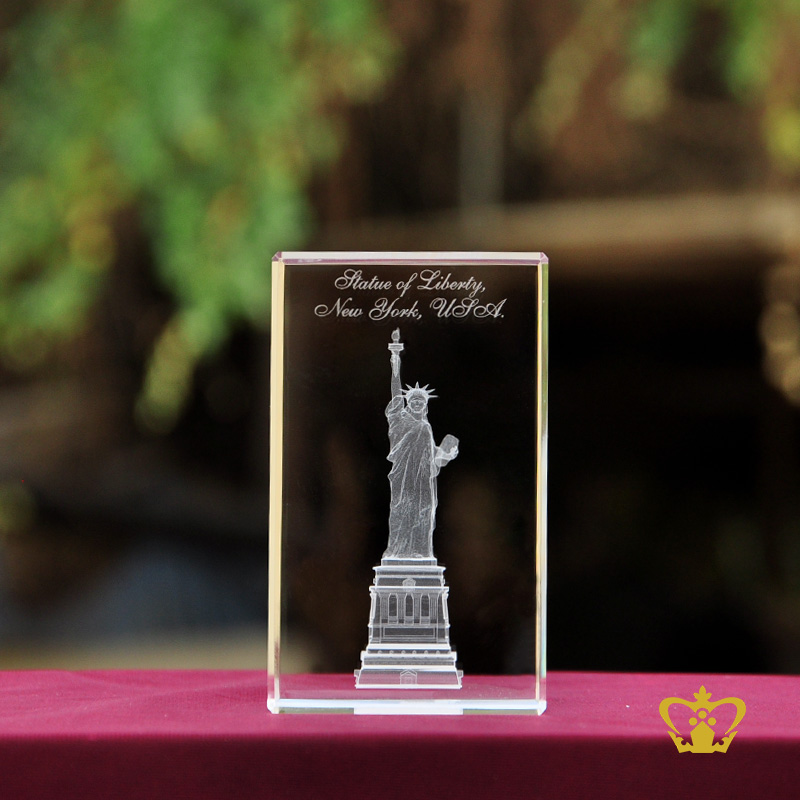 The Statue of Liberty, officially named Liberty Enlightening the World, is a monument symbolising the United States. The statue is placed near the entrance to New York City Harbor. The statue commemorates the signing of the United States Declaration of Independence. You can personalize this crystal cube or rectangular crystal block by engrave your own photo, logo, text, design or any ideas. Click on customize button and upload your image or text and buy online, you can also click on enquiry button we will respond as soon as we can. To produce a 3D crystal, firstly our designers transform any of your ordinary photographs into amazingly 3D images. Then it imprinted or engraved in glass cube using our precision laser technology in crystal cube. 3D crystal cube or blocks are often used for 3D or 2D crystal portraits and given as gifts for wedding, birthdays, Valentine's Day, mother's day, father's day, graduation, convocation , remembrance, memorial or anniversary gift. There are also great corporate or business gifts for recognition awards, promotional paperweights and event mementos. Corporate logos laser engraved inside of the crystal make elegant client and employee gifts. These laser crystals accommodate 3D layered designs where text and image can be engraved at different depths in the crystal. You can add an optional light base and the interaction of the white LED light with the engraving creates bright and sparkling 3D keepsake.