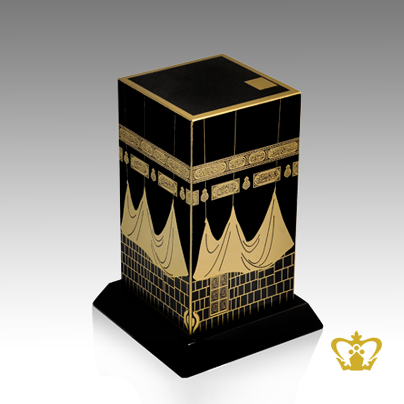 The holy kaaba replica crystal cube handcrafted golden Arabic word calligraphy Quranic verse with black base customized logo text Islamic religious occasions gift Eid Ramadan souvenir