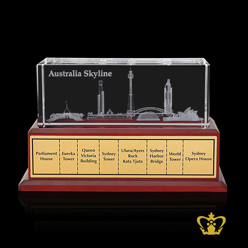 80X80X200 CUBE AUSTRALIA SKYLINE WITH WOODEN LIGHT BASE Parliament House, Eureka Tower, Queen Victoria Building, Sydney Tower, Uluru/Ayers Rock Kata Tjuta,Sydney harbor Bridge,World Tower, Sydney Opera House. You can personalize this crystal cube or rectangular crystal block by engrave your own photo, logo, text, design or any ideas. Click on customize button and upload your image or text and buy online, you can also click on enquiry button we will respond as soon as we can. To produce a 3D crystal, firstly our designers transform any of your ordinary photographs into amazingly 3D images. Then it imprinted or engraved in glass cube using our precision laser technology in crystal cube. 3D crystal cube or blocks are often used for 3D or 2D crystal portraits and given as gifts for wedding, birthdays, Valentine's Day, mother's day, father's day, graduation, convocation , remembrance, memorial or anniversary gift. There are also great corporate or business gifts for recognition awards, promotional paperweights and event mementos. Corporate logos laser engraved inside of the crystal make elegant client and employee gifts. These laser crystals accommodate 3D layered designs where text and image can be engraved at different depths in the crystal. You can add an optional light base and the interaction of the white LED light with the engraving creates bright and sparkling 3D keepsake.