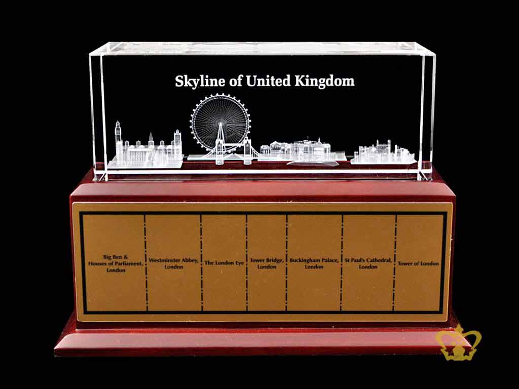 The-skyline-of-United-Kingdom-Famous-historical-Landmark-Structure-3D-Laser-Engraved-in-Crystal-Cube-with-wooden-light-base-Corporate-Gift Product