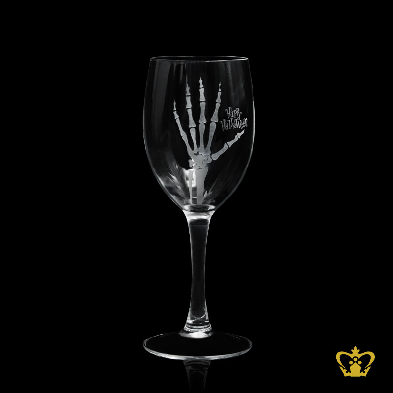 The beverage glass is haunted by a ghostly skeletal hand imprint. Surprise a special wine-lover with a personalized wine glass. Our signature traditional and contemporary handcrafted cutting patterns such as Kay, Pinwheel, Sapolic, Taj Mehrab, Star Jalli, Stuart, Aristocrat, etc and our wide range of shapes and designs are suited to all your wine preferences. Crystal Gallery expert craftsmanship will ensure that you can enjoy fine wines in our luxury crystal white and red wine glasses. Your favorite chilled wines, you're sure to find the perfect wine glass with us as a treat for yourself or for someone special. Whether purchasing for yourself or someone else, our in-house engraving services now make it possible to personalize your wine glass or any bar glasses, decanter, stemware, vases, bowls and other gifts like never before. You can customize wine glass with a message engraved with your text, add a name or include a date, for a keepsake present that they can use for years to come. Our personalized custom engraving options on wine glasses having Icon or Logo with text, One Character Monogram, Two Character Monogram, Three character monogram etc. Say it engraved with our selection of personalized wine glasses engraved with your very own message, great for celebrating birthday's, anniversaries and weddings.