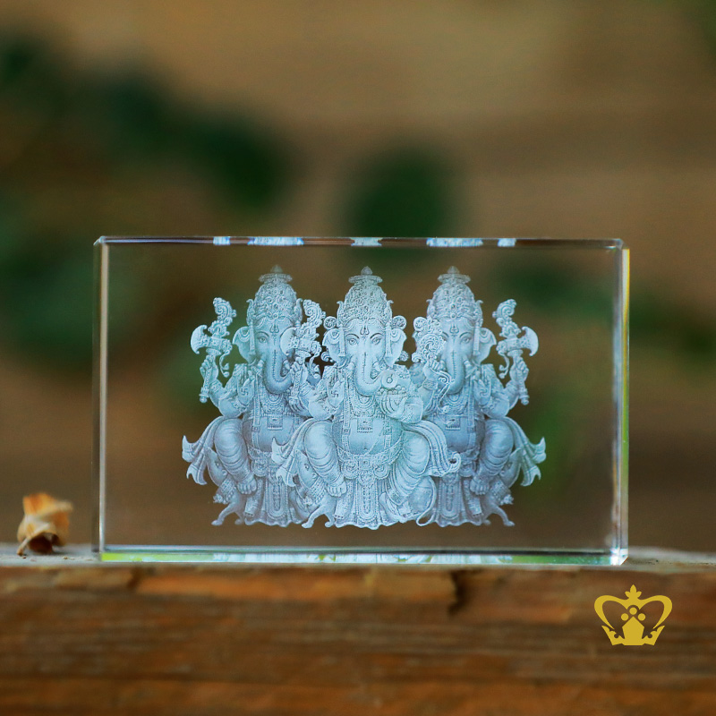 Lord Ganesha or Ganapati is known as the remover of obstacles. Ganesha also known as Ganapati, Vinayaka or by numerous other names, is one of the best-known and most worshipped deities in the Hindu pantheon. Ganesh (also spelled Ganesa or Ganesha and known as Ganapati, Vinayaka and Pillaiyar) is the Lord of Good Fortune who provides prosperity, fortune and success. Ganesha is a very popular god in Hinduism, and was one of the most worshipped. Hindu tradition states that Ganesha was a god of wisdom, success and good luck. He was also giver of different types of favors. The Hindu tradition calls Ganesha as the Vighneshvara. "Vighneshvara" in Sanskrit language means one who was the lord of obstacles or difficulties. Thus, the Hindu tradition states that by worshiping Ganesha, one can remove all obstacles and difficulties.You can personalize this crystal cube or rectangular crystal block by engrave your own photo, logo, text, design or any ideas. Click on customize button and upload your image or text and buy online, you can also click on enquiry button we will respond as soon as we can. To produce a 3D crystal, firstly our designers transform any of your ordinary photographs into amazingly 3D images. Then it imprinted or engraved in glass cube using our precision laser technology in crystal cube. 3D crystal cube or blocks are often used for 3D or 2D crystal portraits and given as gifts for wedding, birthdays, Valentine's Day, mother's day, father's day, graduation, convocation , remembrance, memorial or anniversary gift. There are also great corporate or business gifts for recognition awards, promotional paperweights and event mementos. Corporate logos laser engraved inside of the crystal make elegant client and employee gifts. These laser crystals accommodate 3D layered designs where text and image can be engraved at different depths in the crystal. You can add an optional light base and the interaction of the white LED light with the engraving creates bright and sparkling 3D keepsake.
