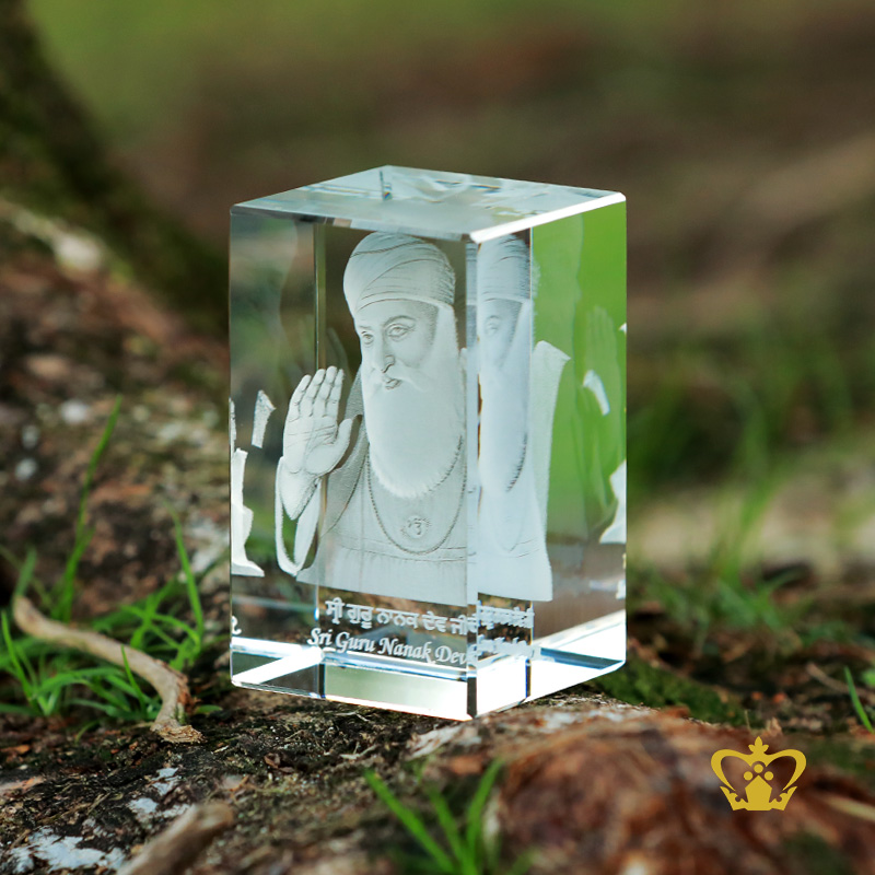 Guru Nanak is the founder of Sikhism & also noted to be the first of the 10 Sikh Gurus. Guru Nanak was the founder of Sikhism and the first of the ten Sikh Gurus. His birth is celebrated worldwide as Guru Nanak Gurpurab on Kartik Pooranmashi, the full-moon day in the month of Katak, October-November. You can personalize this crystal cube or rectangular crystal block by engrave your own photo, logo, text, design or any ideas. Click on customize button and upload your image or text and buy online, you can also click on enquiry button we will respond as soon as we can. To produce a 3D crystal, firstly our designers transform any of your ordinary photographs into amazingly 3D images. Then it imprinted or engraved in glass cube using our precision laser technology in crystal cube. 3D crystal cube or blocks are often used for 3D or 2D crystal portraits and given as gifts for wedding, birthdays, Valentine's Day, mother's day, father's day, graduation, convocation , remembrance, memorial or anniversary gift. There are also great corporate or business gifts for recognition awards, promotional paperweights and event mementos. Corporate logos laser engraved inside of the crystal make elegant client and employee gifts. These laser crystals accommodate 3D layered designs where text and image can be engraved at different depths in the crystal. You can add an optional light base and the interaction of the white LED light with the engraving creates bright and sparkling 3D keepsake.