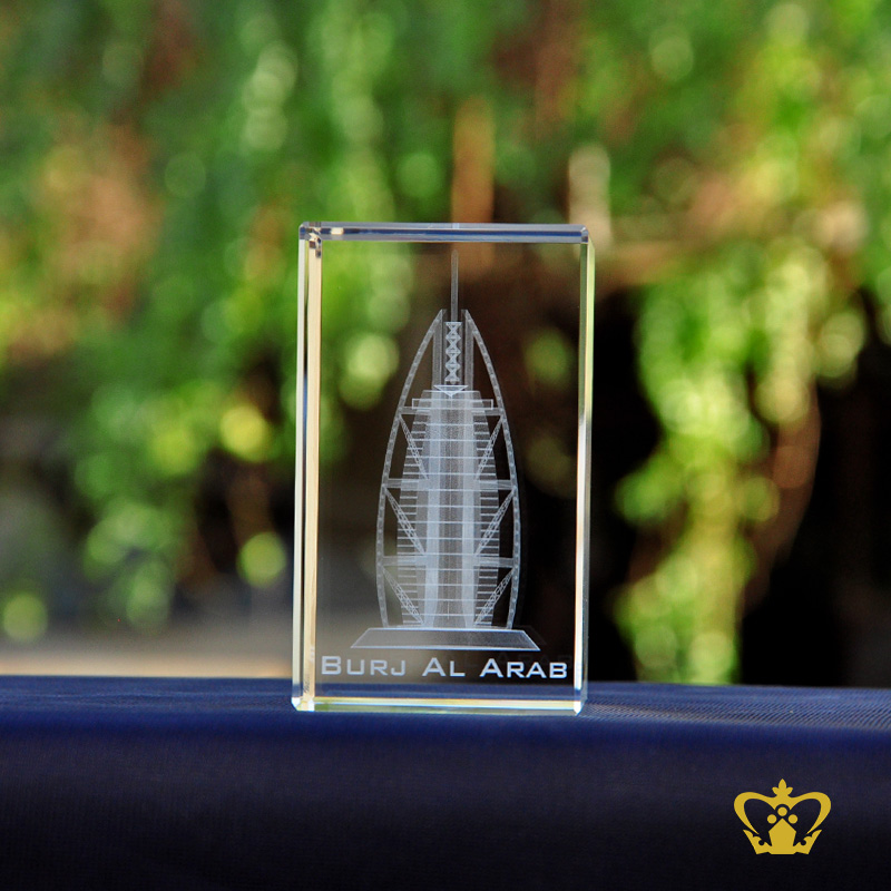 The Burj Al Arab is the 4th tallest hotel in the world, standing a staggering 321m or 1,053ft tall. The Burj Al Arab (Arabic: Tower of the Arabs) is a luxury hotel located in Dubai, United Arab Emirates. You can personalize this crystal cube or rectangular crystal block by engrave your own photo, logo, text, design or any ideas. Click on customize button and upload your image or text and buy online, you can also click on enquiry button we will respond as soon as we can. To produce a 3D crystal, firstly our designers transform any of your ordinary photographs into amazingly 3D images. Then it imprinted or engraved in glass cube using our precision laser technology in crystal cube. 3D crystal cube or blocks are often used for 3D or 2D crystal portraits and given as gifts for wedding, birthdays, Valentine's Day, mother's day, father's day, graduation, convocation , remembrance, memorial or anniversary gift. There are also great corporate or business gifts for recognition awards, promotional paperweights and event mementos. Corporate logos laser engraved inside of the crystal make elegant client and employee gifts. These laser crystals accommodate 3D layered designs where text and image can be engraved at different depths in the crystal. You can add an optional light base and the interaction of the white LED light with the engraving creates bright and sparkling 3D keepsake.
