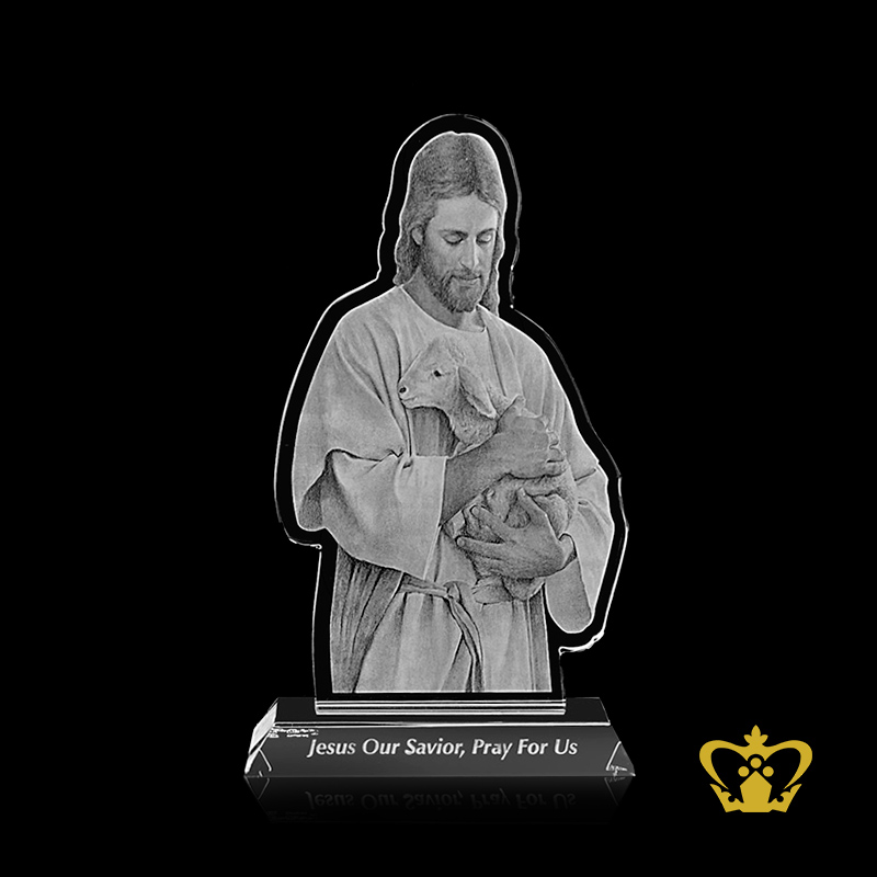 The Lord Jesus Christ - The Good Shepherd is lovingly depicted in a crystal cutout. As per the Christian faithful, Jesus Christ is the son of God, the redeemer of the world. Jesus, also referred to as Jesus of Nazareth and Jesus Christ, was a first-century Jewish preacher and religious leader. He is the central figure of Christianity. Most Christians believe he is the incarnation of God the Son and the awaited Messiah (Christ) prophesied in the Old Testament. Our customizable award plaques available in different shapes and styles that will be suitable for any occasion. Choose from our unique plaques for ongoing awards, corporate gift in various event, or single plaques to recognize individual achievement. Custom engraved plaques come in a variety of materials, such as crystal, glass, wood, metal and acrylic. We recommend sorting through our selection for traditional, memorial, and photo plaques as well. Whatever plaque you choose, we can add custom engravings to any of the items that interest you. Our advanced engraving services can place your organization's logo directly onto the plate. Order yours online today by click on customize button and upload your logo or image and text, you can also click on enquiry button we will respond as soon as we can.