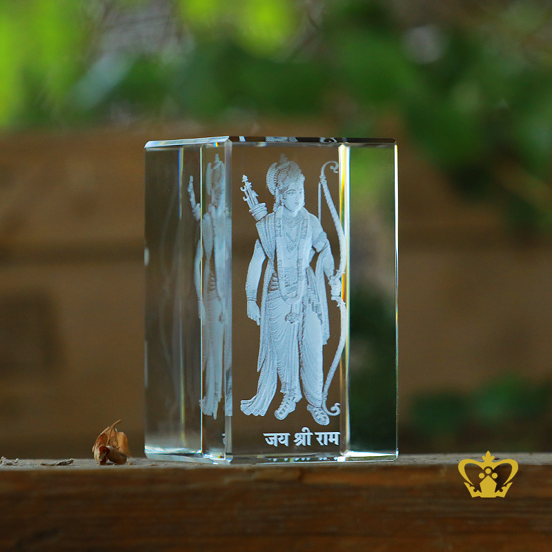 A popular deity, Lord Rama is the main character in the Hindu epic Ramayana. Rama (or Ramacandra) is the seventh avatar of the Hindu god Vishnu. His adventures, notably the slaying of the demon king Ravana, are recounted in the Vana Parva of the Mahabharata and in the Ramayana, the oldest Sanskrit epic, written sometime in the 5th century BCE but with some later additions. You can personalize this crystal cube or rectangular crystal block by engrave your own photo, logo, text, design or any ideas. Click on customize button and upload your image or text and buy online, you can also click on enquiry button we will respond as soon as we can. To produce a 3D crystal, firstly our designers transform any of your ordinary photographs into amazingly 3D images. Then it imprinted or engraved in glass cube using our precision laser technology in crystal cube. 3D crystal cube or blocks are often used for 3D or 2D crystal portraits and given as gifts for wedding, birthdays, Valentine's Day, mother's day, father's day, graduation, convocation , remembrance, memorial or anniversary gift. There are also great corporate or business gifts for recognition awards, promotional paperweights and event mementos. Corporate logos laser engraved inside of the crystal make elegant client and employee gifts. These laser crystals accommodate 3D layered designs where text and image can be engraved at different depths in the crystal. You can add an optional light base and the interaction of the white LED light with the engraving creates bright and sparkling 3D keepsake.