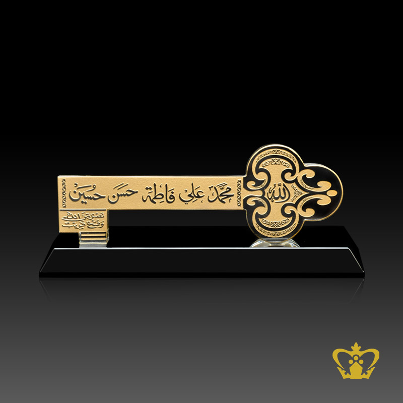 Ramadan-Souvenir-Islamic-Occasions-Eid-Gift-Religious-Pure-Panjtan-Golden-Arabic-word-Calligraphy-Engraved-Customized-Crystal-Key-Cut-out-with-Black-Base Product Product Product Product