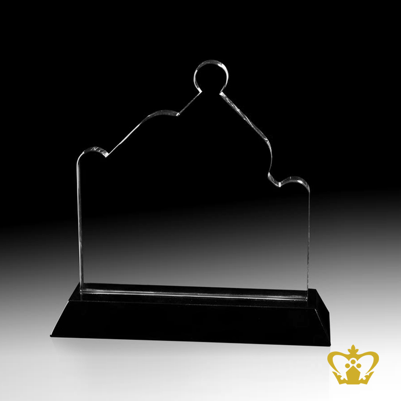 Customized crystal cutout trophy with black base logo text engraving