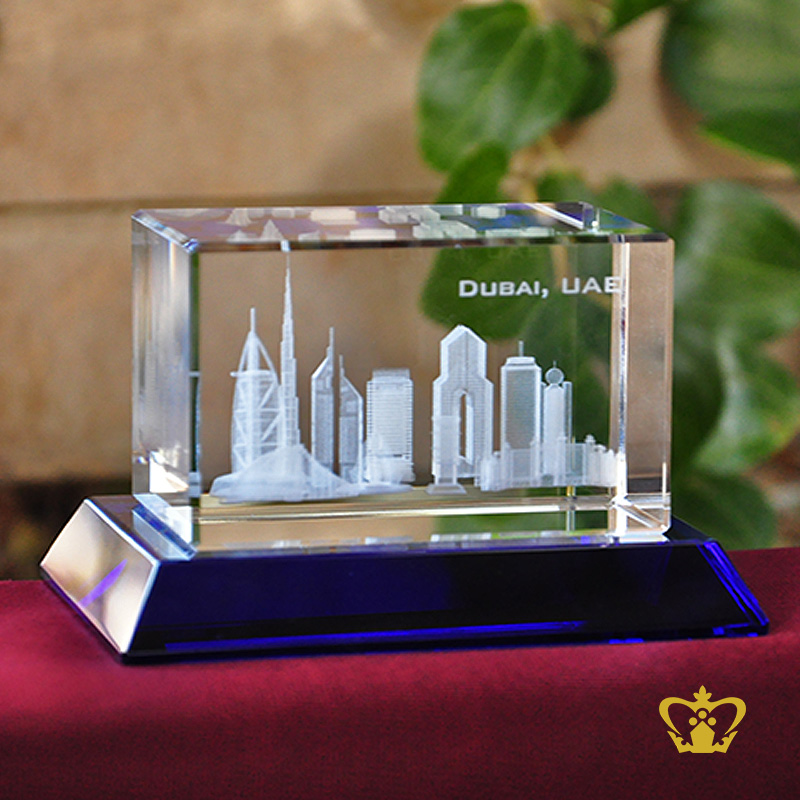 The majestic monuments of Dubai are captured in 3D within a crystal cube featuring a blue tinge. Dubai is a city and emirate in the United Arab Emirates known for luxury shopping, ultramodern architecture and a lively nightlife scene. Burj Khalifa, an 830m-tall tower, dominates the skyscraper-filled skyline. The breathtaking Dubai skyline with elegantly customized with iconic Burj Al Arab, Burj Khalifa and other famous landmarks of Dubai makes a beautiful gift for someone who is leaving for pastures new.Our wide range of Dubai Abu Dhabi UAE tourist gift collections stocks include a full range of souvenirs, laser 3D engraved gifts, crystal replicas of famous land marks, customized items, gifts and many more with fantastic prices! So, don't miss one of the best shop in Dubai for presents and souvenirs. No trip is complete without a few souvenirs to take back home and help preserve the happy holiday memories. Buy stylish crystal mementos to stow in your checked luggage to remind you of your unique desert adventures. Your experience and memories of living in Dubai Abu Dhabi UAE showcase with beautiful souvenir or gift. Creating Memories is a Priceless Gift. You can get an online gift delivery to Dubai Abu Dhabi or anywhere in the world of such extraordinary gifts memento tourist souvenirs and many more.