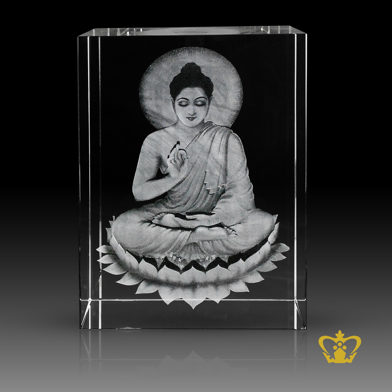 Siddhartha Gautama or Lord Buddha (Enlightened One) is known as the founder of Buddhism. You can personalize this crystal cube or rectangular crystal block by engrave your own photo, logo, text, design or any ideas. Click on customize button and upload your image or text and buy online, you can also click on enquiry button we will respond as soon as we can. To produce a 3D crystal, firstly our designers transform any of your ordinary photographs into amazingly 3D images. Then it imprinted or engraved in glass cube using our precision laser technology in crystal cube. 3D crystal cube or blocks are often used for 3D or 2D crystal portraits and given as gifts for wedding, birthdays, Valentine's Day, mother's day, father's day, graduation, convocation , remembrance, memorial or anniversary gift. There are also great corporate or business gifts for recognition awards, promotional paperweights and event mementos. Corporate logos laser engraved inside of the crystal make elegant client and employee gifts. These laser crystals accommodate 3D layered designs where text and image can be engraved at different depths in the crystal. You can add an optional light base and the interaction of the white LED light with the engraving creates bright and sparkling 3D keepsake.