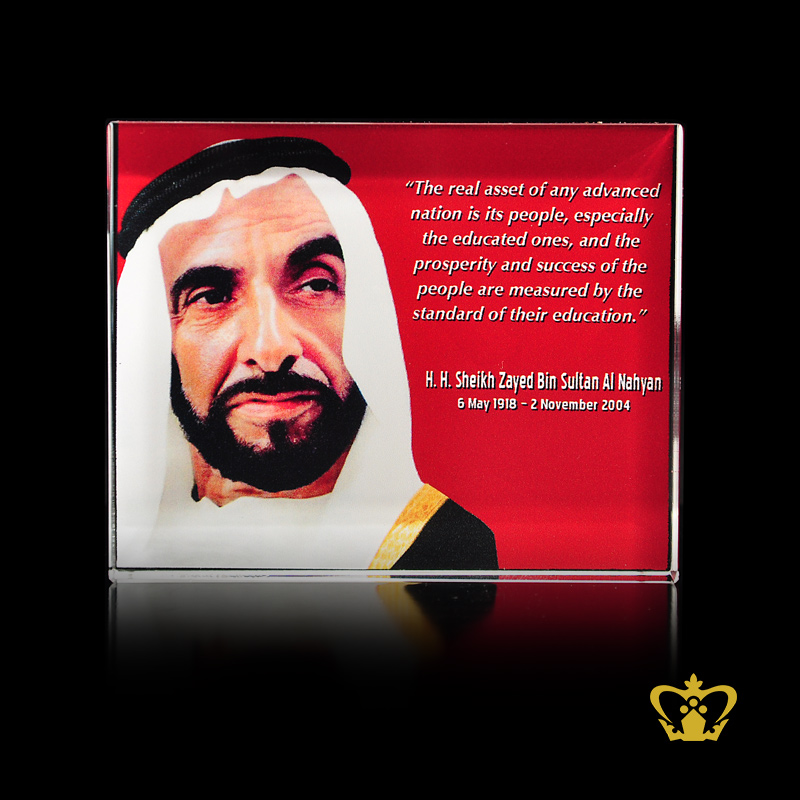 H. H. Sheikh Zayed Bin Sultan Al Nahyan with his most popular quotes color printed on crystal rectangular plaque Inspirational motivational gifts customized logo text