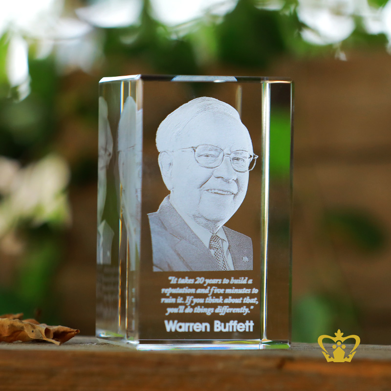 Crystal rectangular cube 3D laser engraved Warren Buffett with his most popular quotes etched