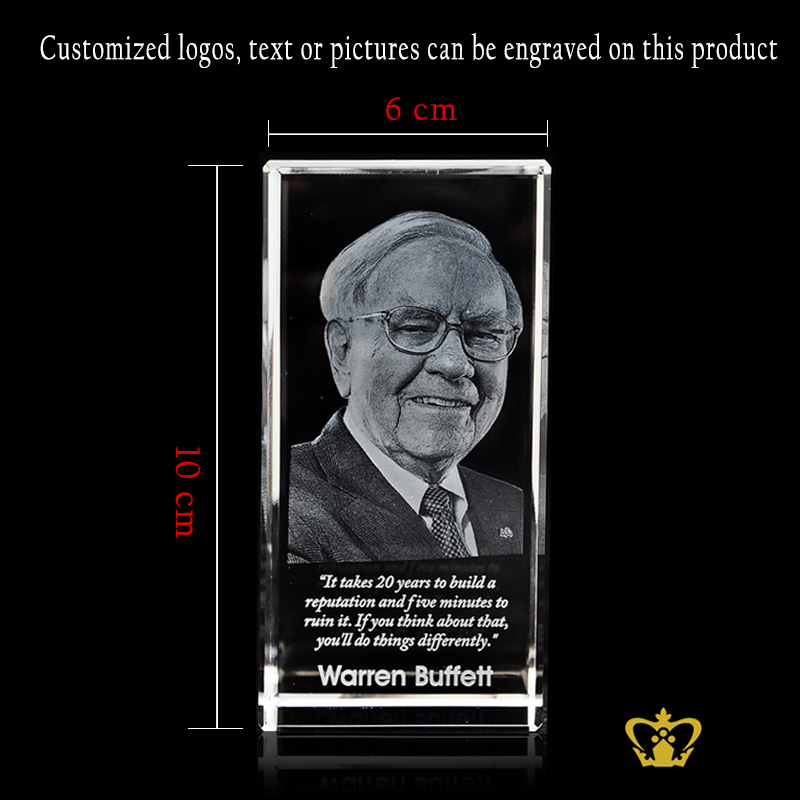 Crystal rectangular cube 3D laser engraved Warren Buffett with his most popular quotes etched