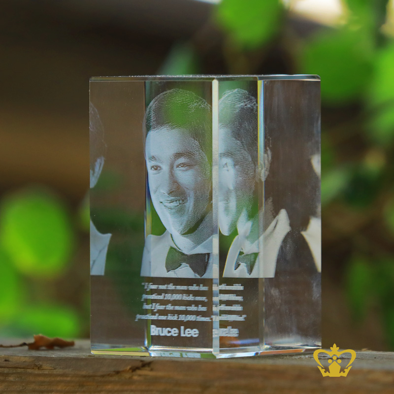 Crystal rectangular cube 3D laser engraved Bruce Lee with his most popular quotes etched
