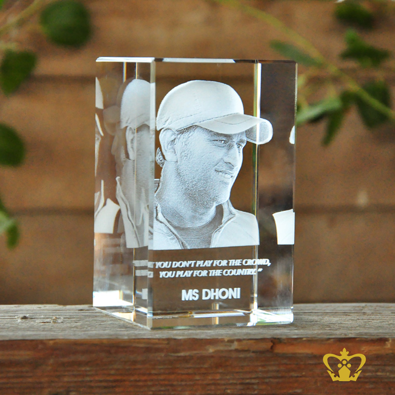 3D laser engraved crystal rectangular cube famous Indian cricketer Mahendra Singh Dhoni with his most popular quotes etched