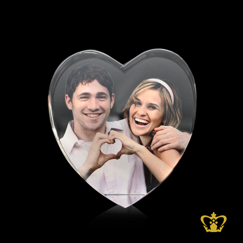 You can personalize this crystal heart shape block by engrave your own photo, text, design or any ideas. Click on customize button and upload your image or text and buy online, you can also click on enquiry button we will respond as soon as we can. Gifts featuring personalized heart shaped 3D photo crystals from CrystalGallery.com is synonymous with love, so show the world who you love the most with a heart shaped photo crystal. The laser etched glass will capture every detail of your favorite photograph, so detailed that you will find yourself staring at the beautiful craftsmanship. This heart shaped photo crystal could be your choice for the next birthday or anniversary. To produce a 3D crystal, firstly our designers transform any of your ordinary photographs into amazingly 3D images. Then it imprinted or engraved in crystal cube using our precision laser technology. Crystal heart shape blocks are often used for 3D or 2D crystal portraits and given as gifts for wedding, birthdays, Valentine's Day, mother's day, father's day, remembrance or anniversary gift. Whether you're shopping for your mom, sister or wife this holiday season, give them a gift that's as unique and thoughtful as they are.