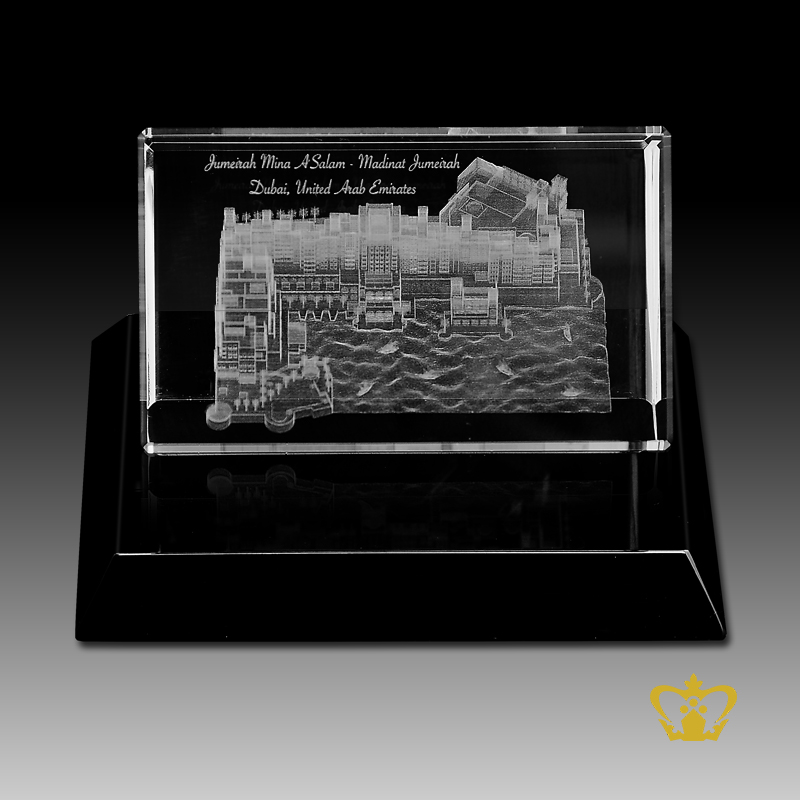 Dubai-UAE-tourist-souvenir-Madinat-Jumeirah-famous-land-mark-3D-Laser-engraved-tilted-crystal-cube-with-black-base-traveler-s-gift- Product Product Product