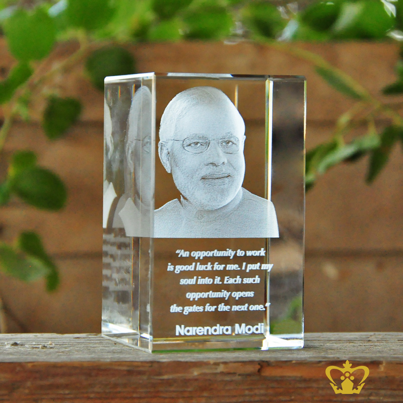 Crystal rectangular cube 3D laser engraved Narendra Modi with his most popular quotes etched