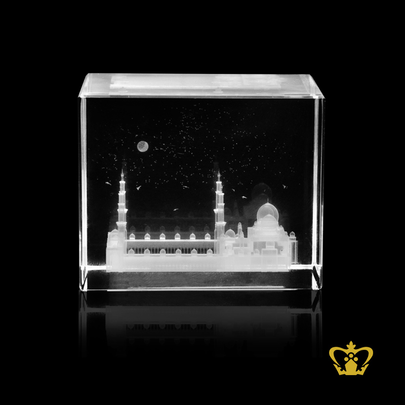 The Sheikh Zayed Grand Mosque is located in Abu Dhabi, the capital city of the United Arab Emirates. The largest mosque in the country, it is the key place of worship for daily prayers, Friday gathering and Eid prayers. During Eid, it may be visited by more than 41,000 people. You can personalize this crystal cube or rectangular crystal block by engrave your own photo, logo, text, design or any ideas. Click on customize button and upload your image or text and buy online, you can also click on enquiry button we will respond as soon as we can. To produce a 3D crystal, firstly our designers transform any of your ordinary photographs into amazingly 3D images. Then it imprinted or engraved in glass cube using our precision laser technology in crystal cube. 3D crystal cube or blocks are often used for 3D or 2D crystal portraits and given as gifts for wedding, birthdays, Valentine's Day, mother's day, father's day, graduation, convocation , remembrance, memorial or anniversary gift. There are also great corporate or business gifts for recognition awards, promotional paperweights and event mementos. Corporate logos laser engraved inside of the crystal make elegant client and employee gifts. These laser crystals accommodate 3D layered designs where text and image can be engraved at different depths in the crystal. You can add an optional light base and the interaction of the white LED light with the engraving creates bright and sparkling 3D keepsake.