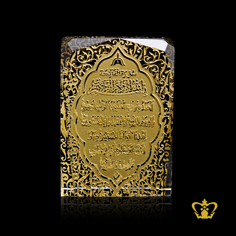 Skillful Islamic calligraphy is nestled amidst intriguing golden embellishments. Crystal Gallery represent the craft traditions of the Islamic world with uncompromising quality and exceptional craftsmanship: to bring you a fine selection of unique handcrafted crystal corporate Islamic Gifts. Our Islamic artifacts gift decor collections are increasingly popular locally in Dubai, UAE, GCC and abroad. With a portfolio of high profile clients, our luxury giveaways have added the perfect awe-aspiring touch to many occasions and events. Our brand is widely recognized and endorsed by our clients for its classy Islamic gift collections and excellence of service. We design experiences in the world of luxury corporate gifts. This Modern Islamic Art handcrafted decorative item is the perfect addition to your home decor! Also can makes a great housewarming gift, Eid Gift, Ramadan Gift, Shahadah, gift for someone returning home from Hajj! Surah Al-Fatihah is the first chapter (surah) of the Quran. Its six or seven verses (ayat) are a prayer for the guidance, lordship, and mercy of God.
