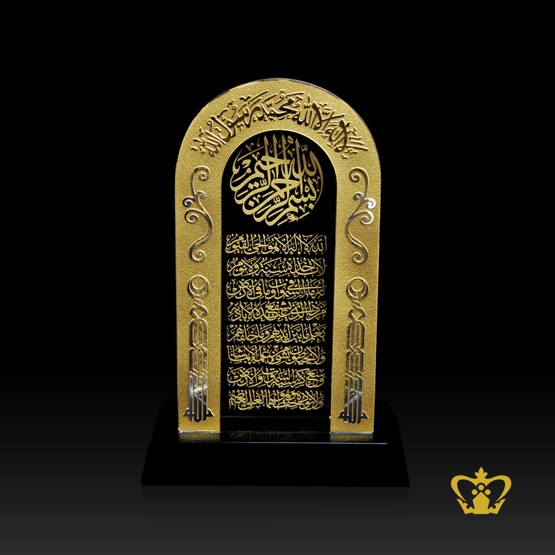 Arabic word Calligraphy Bismillah Ir Rehman Ir Rahim Ayat Al Kursi La Ilaha Illa Allah Muhammed Rasul Allah engraved Mehrab Cut Crystal Islamic Gift Religious Souvenir with Black Base customized logo text