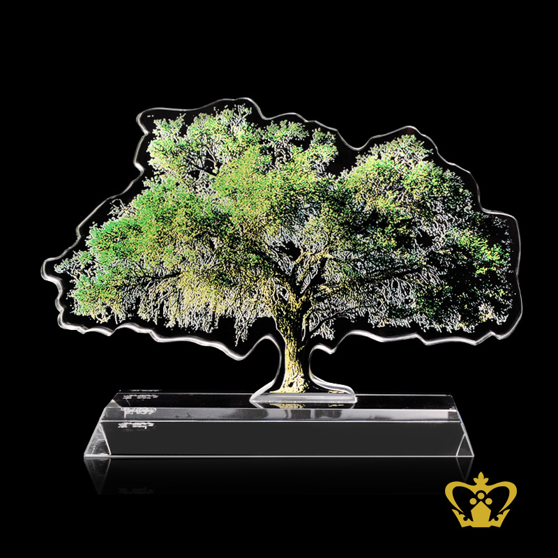Artistry crystal cutout of a tree stands on a clear crystal base customized text engraving logo