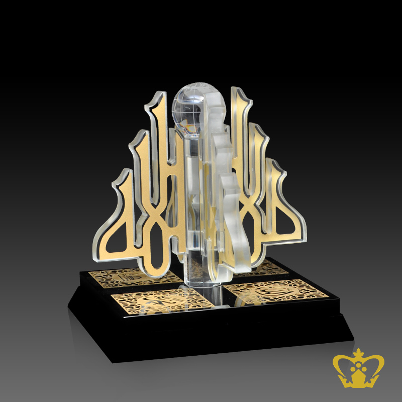 Rotating crystal cutout of word Allah with globe Arabic word calligraphy Allah Muhammed Rasul Allah and the Holy Kaaba engraved on base religious occasions Islamic Ramadan Eid souvenir