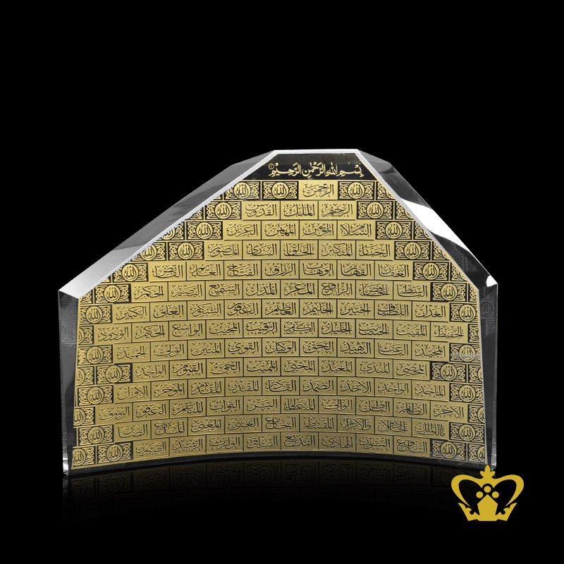 Crescent crystal plaque golden Arabic word calligraphy engraved Asma Al Husna Islamic occasions religious gift Ramadan souvenir
