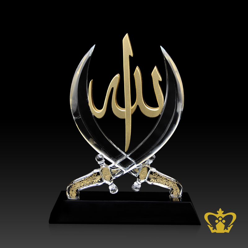 Crystal cutout of word Allah with two sword stands on black base religious occasions Islamic Ramadan Eid gift souvenir